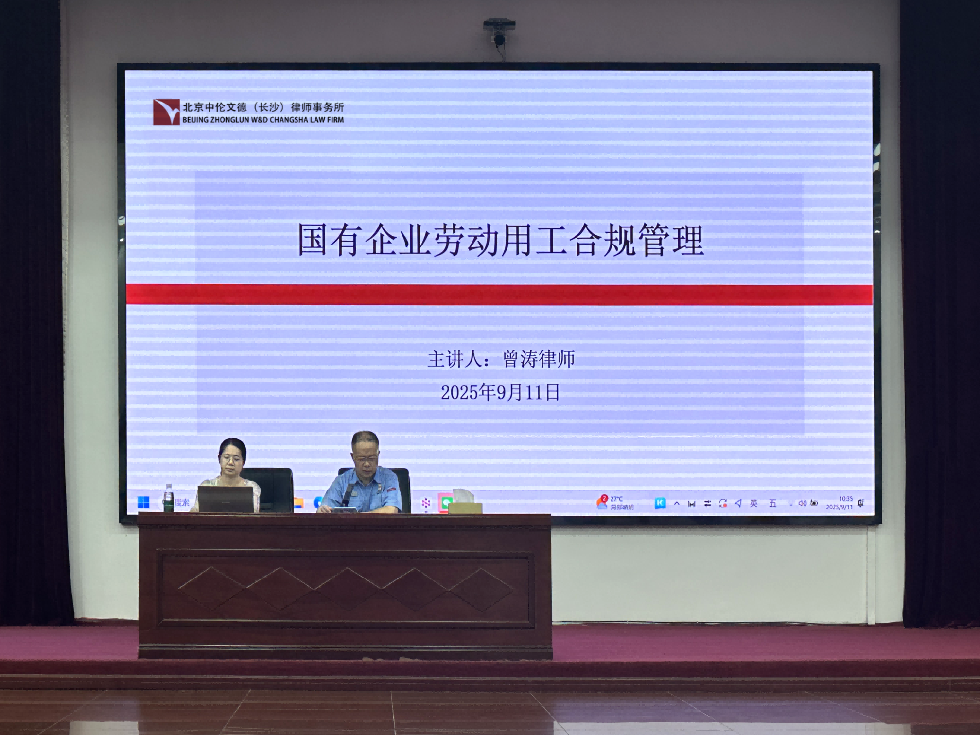 9月11日,曾涛律师受邀为顾问单位开展“国有企业劳动用工合规管理”专题讲座。本次讲座紧密结合公司在实际劳动用工过程中面临的各类问题,系统梳理了劳动用工领域的合规要点与风险防范策略,助力企业提升用工管理水平,有效控制用工风险。