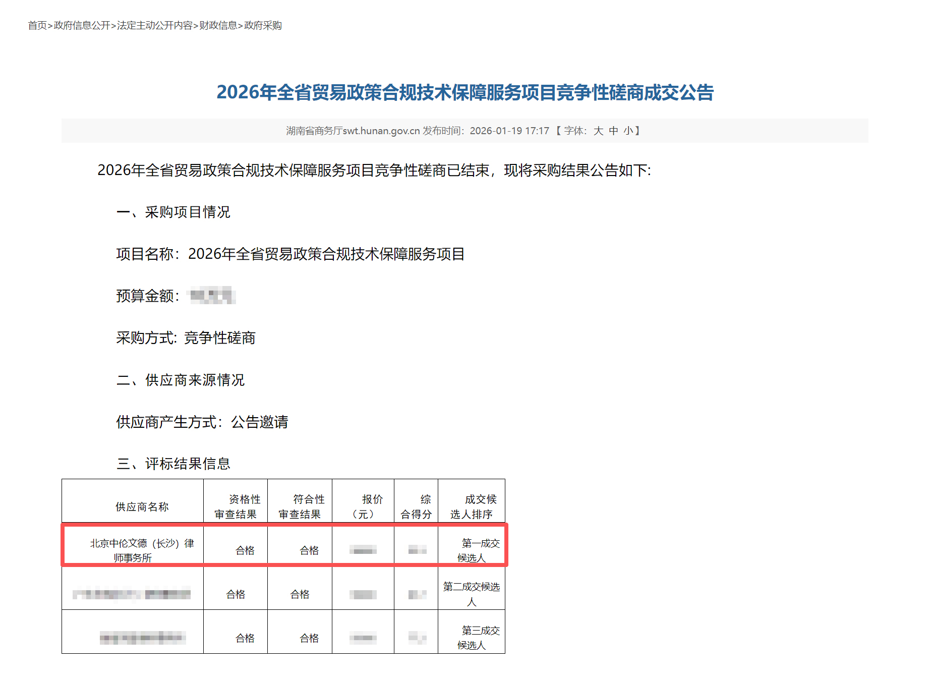 2026年1月,北京中伦文德(长沙)律师事务所获聘担任湖南省商务厅本年度全省贸易政策合规技术保障服务项目法律顾问。本项目由高级合伙人何畅文牵头,由涉外业务部主任段优与狄丽君、杨锦仪、刘思湘、刘子畅等多名律师共同组成法律服务团队为湖南省商务厅提供专项法律服务。